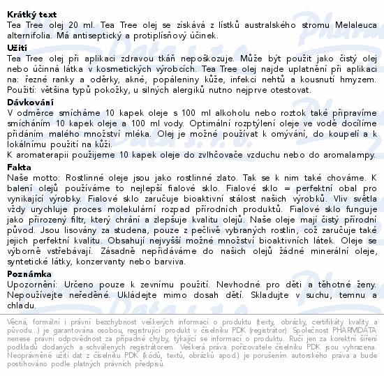 Tea Tree olej 20 ml. Tea Tree olej se získává z lístků australského stromu Melaleuca alternifolia. Má antiseptický a protiplísňový účinek.