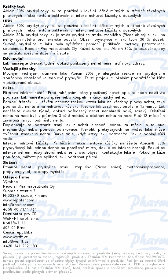 Abicin 30% pryskyřicový lak se používá k lokální léčbě mírných a středně závažných plísňových infekcí nehtů a bakteriálních infekcí nehtové kůžičky u dospělých.