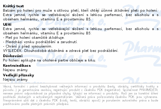 Balzám po holení pro muže s citlivou pletí, kteří chtějí účinné zklidnění pleti po holení. Extra jemné, rychle se vstřebávající složení s lehkou parfemací, bez alkoholu a s obsahem heřmánku, vitamínu E a provitamínu B5.
