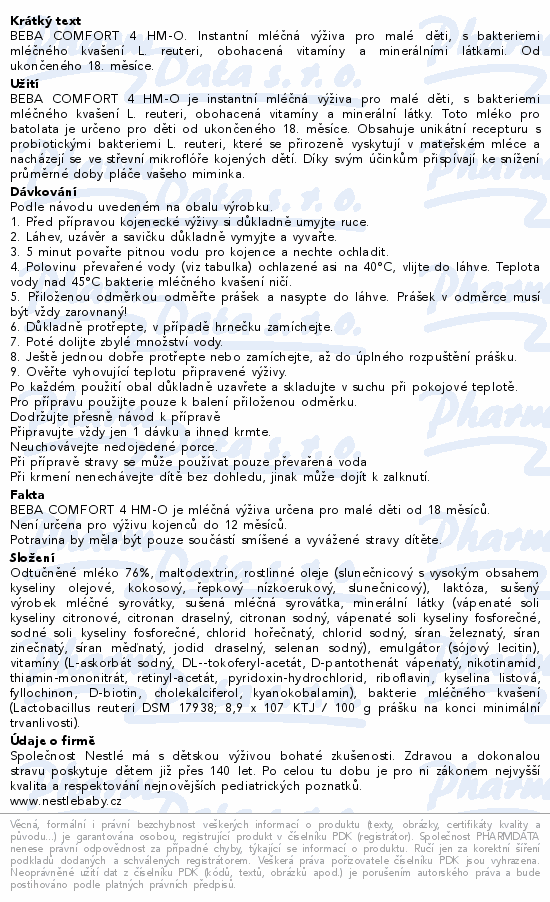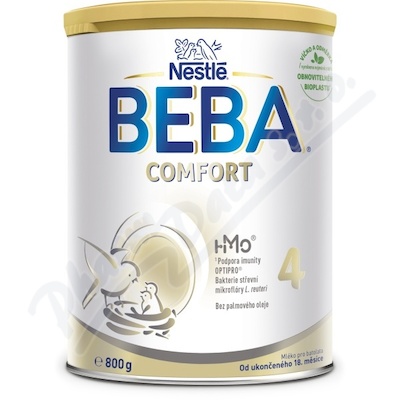 BEBA COMFORT 4 HM-O. Instantní mléčná výživa pro malé děti, s bakteriemi mléčného kvašení L. reuteri, obohacená vitamíny a minerálními látkami. Od ukončeného 18. měsíce.