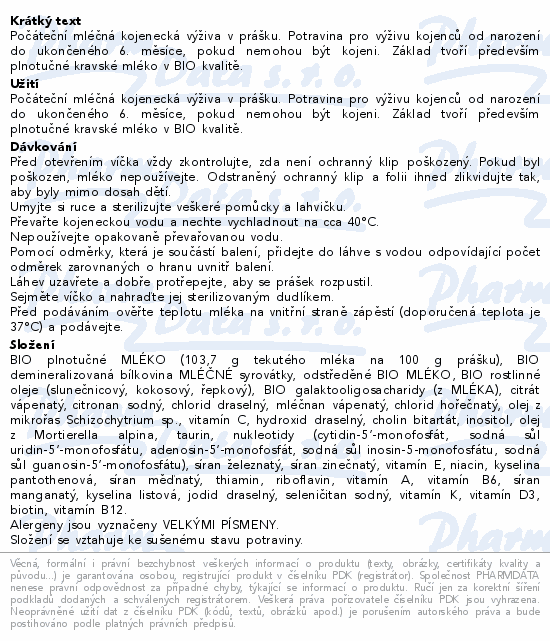Počáteční mléčná kojenecká výživa v prášku. Potravina pro výživu kojenců od narození do ukončeného 6. měsíce, pokud nemohou být kojeni. Základ tvoří především plnotučné kravské mléko v BIO kvalitě.