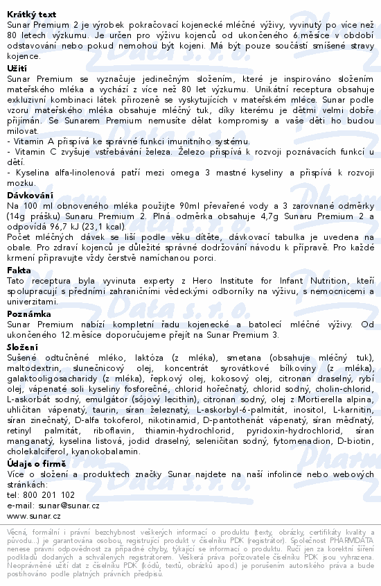 Sunar Premium 2 je výrobek pokračovací kojenecké mléčné výživy, vyvinutý po více než 80 letech výzkumu. Je určen pro výživu kojenců od ukončeného 6.měsíce v období odstavování nebo pokud nemohou být kojeni. Má být pouze součástí smíšené stravy kojence.