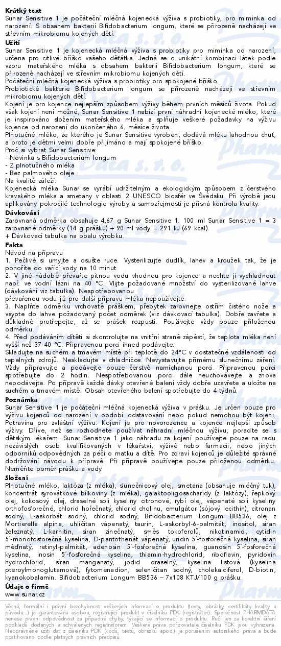 Sunar Sensitive 1 je počáteční mléčná kojenecká výživa s probiotiky, pro miminka od narození. S obsahem bakterií Bifidobacterium longum, které se přirozeně nacházejí ve střevním mikrobiomu kojených dětí.