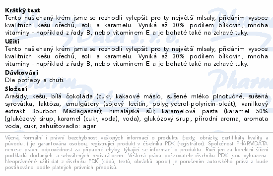 Tento našlehaný krém jsme se rozhodli vylepšit pro ty největší mlsaly, přidáním vysoce kvalitních kešu ořechů, soli a karamelu. Vyniká až 30% podílem bílkovin, mnoha vitamíny - například z řady B, nebo vitamínem E a je bohaté také na zdravé tuky.