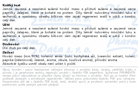 Jemně zauzené a nasolené sušené hovězí maso s příchutí sušená a zauzené verze papričky Jalapeo, které je bohaté na protein. Díky téměř nulovému množství tuku a sacharidů a vysokému obsahu bílkovin vám zajistí regeneraci svalů a udrží v kondici celý den.