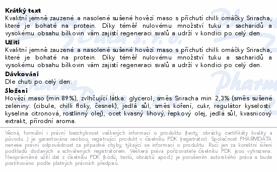 Kvalitní jemně zauzené a nasolené sušené hovězí maso s příchutí chilli omáčky Sriracha, které je bohaté na protein. Díky téměř nulovému množství tuku a sacharidů a vysokému obsahu bílkovin vám zajistí regeneraci svalů a udrží v kondici po celý den.