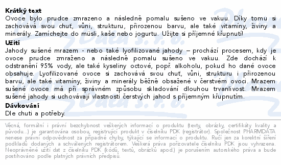Ovoce bylo prudce zmrazeno a následně pomalu sušeno ve vakuu. Díky tomu si zachovává svou chuť, vůni, strukturu, přirozenou barvu, ale také vitamíny, živiny a minerály. Zamíchejte do müsli, kaše nebo jogurtu. Užijte si příjemné křupnutí!