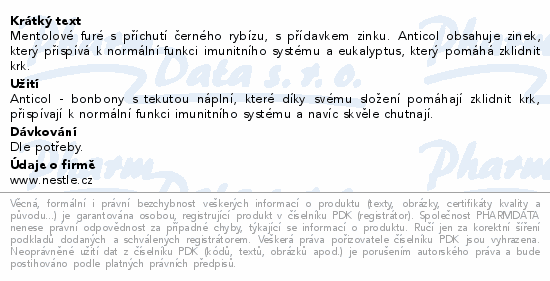 Mentolové furé s příchutí černého rybízu, s přídavkem zinku. Anticol obsahuje zinek, který přispívá k normální funkci imunitního systému a eukalyptus, který pomáhá zklidnit krk.