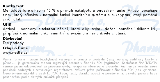 Mentolové furé s náplní 15 % s příchutí eukalyptu a přídavkem zinku. Anticol obsahuje zinek, který přispívá k normální funkci imunitního systému a eukalyptus, který pomáhá zklidnit krk.