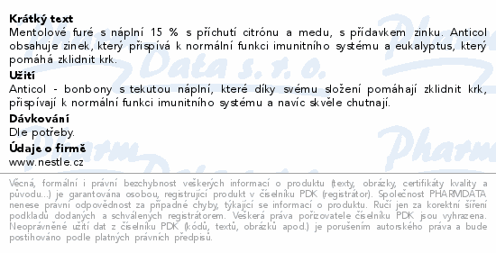 Mentolové furé s náplní 15 % s příchutí citrónu a medu, s přídavkem zinku. Anticol obsahuje zinek, který přispívá k normální funkci imunitního systému a eukalyptus, který pomáhá zklidnit krk.