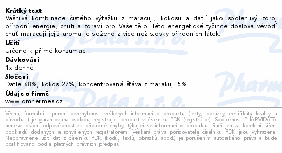 Vášnivá kombinace čistého výtažku z maracuji, kokosu a datlí jako spolehlivý zdroj přírodní energie, chuti a zdraví pro Vaše tělo. Této energetické tyčince doslova vévodí chuť maracuji jejíž aroma je složeno z více než stovky přírodních látek.