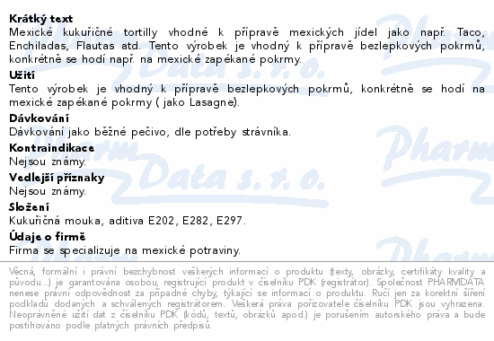 Mexické kukuřičné tortilly vhodné k přípravě mexických jídel jako např. Taco, Enchiladas, Flautas atd. Tento výrobek je vhodný k přípravě bezlepkových pokrmů, konkrétně se hodí např. na mexické zapékané pokrmy.