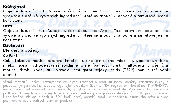 Objevte luxusní chuť Dubaje s čokoládou Lee Choc. Tato prémiová čokoláda je vyrobena z pečlivě vybraných ingrediencí, které se snoubí v lahodné a sametově jemné konzistenci.