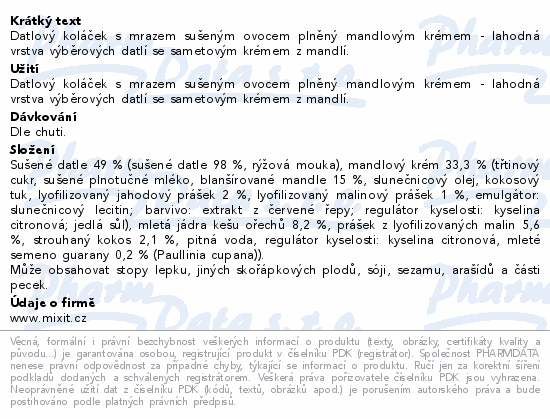 Datlový koláček s mrazem sušeným ovocem plněný mandlovým krémem - lahodná vrstva výběrových datlí se sametovým krémem z mandlí.