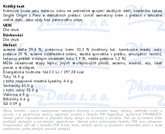Krémové koule jsou italskou ódou na jedinečné spojení sladkých datlí, kvalitního kakaa Single Origin z Peru a delikátních pistácií. Uvnitř sametový krém z pistácií v lahodné vrstvě datlí. Jako vždy bez palmového oleje.