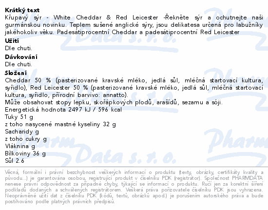 Křupavý sýr - White Cheddar & Red Leicester -Řekněte sýr a ochutnejte naši gurmánskou novinku. Teplem sušené anglické sýry, jsou delikatesa určená pro labužníky jakéhokoliv věku. Padesátiprocentní Cheddar a padesátiprocentní Red Leicester