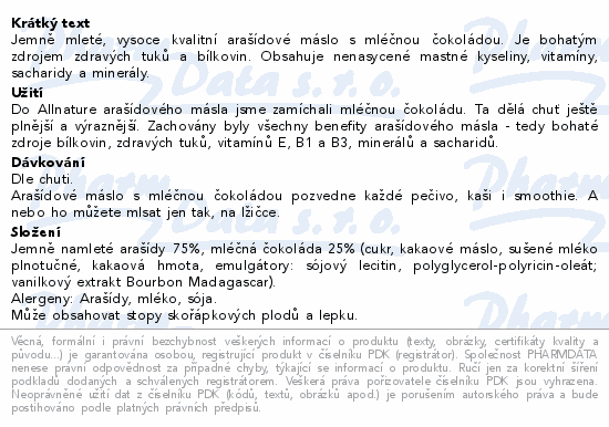 Jemně mleté, vysoce kvalitní arašídové máslo s mléčnou čokoládou. Je bohatým zdrojem zdravých tuků a bílkovin. Obsahuje nenasycené mastné kyseliny, vitamíny, sacharidy a minerály.