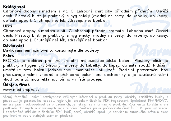Citronové dropsy s medem a vit. C. Lahodná chuť díky přírodním příchutím. Osvěží dech. Plastový blistr je praktický a hygienický (vhodný na cesty, do kabelky, do kapsy, do auta apod.). Chutnější než lék, zdravější než bonbon.