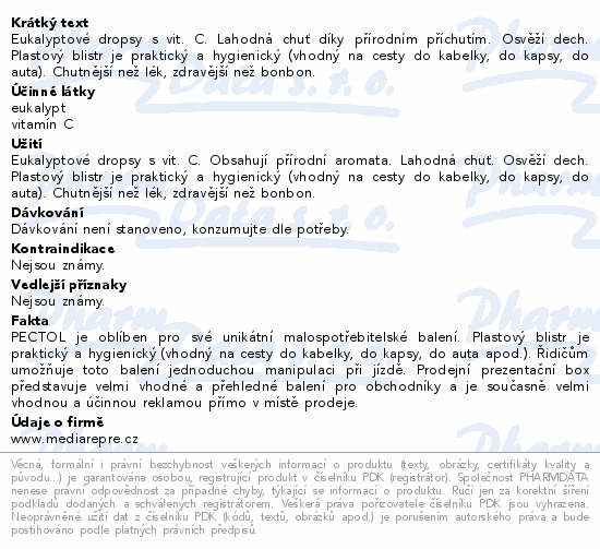 Eukalyptové dropsy s vit. C. Lahodná chuť díky přírodním příchutím. Osvěží dech. Plastový blistr je praktický a hygienický (vhodný na cesty do kabelky, do kapsy, do auta). Chutnější než lék, zdravější než bonbon.