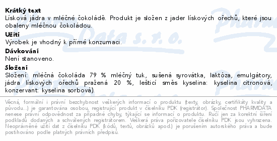 Lísková jádra v mléčné čokoládě. Produkt je složen z jader lískových ořechů, které jsou obaleny mléčnou čokoládou.