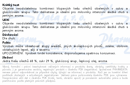 Objevte neodolatelnou kombinaci křupavých kešu ořechů obalených v cukru a glukózovém sirupu. Tato delikatesa je ideální pro milovníky intenzivní sladké chuti s jemným aroma.
