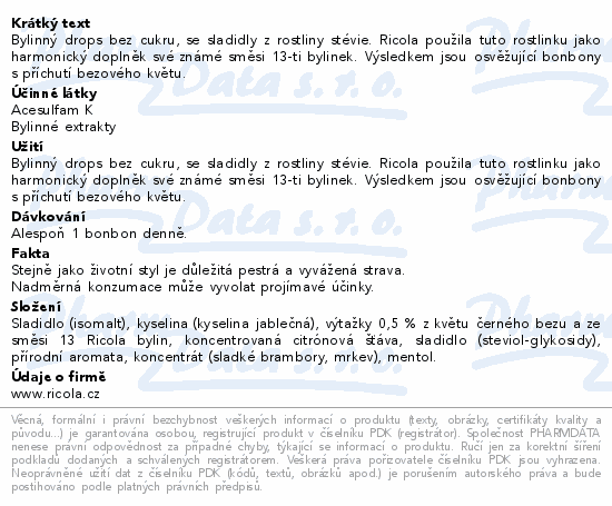 Bylinný drops bez cukru, se sladidly z rostliny stévie. Ricola použila tuto rostlinku jako harmonický doplněk své známé směsi 13-ti bylinek. Výsledkem jsou osvěžující bonbony s příchutí bezového květu.