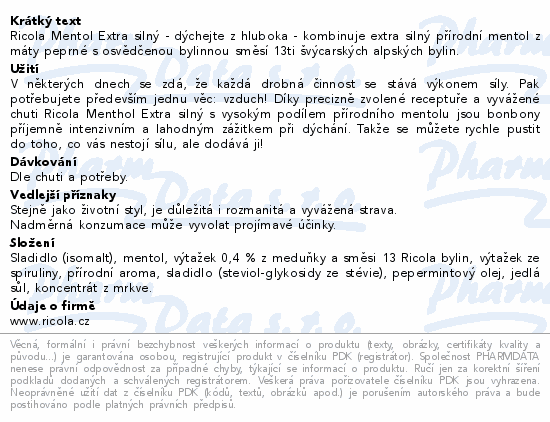 Ricola Mentol Extra silný - dýchejte z hluboka - kombinuje extra silný přírodní mentol z máty peprné s osvědčenou bylinnou směsí 13ti švýcarských alpských bylin.