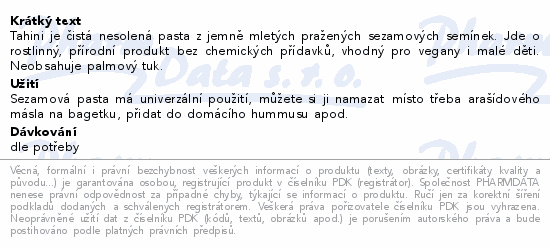 Tahini je čistá nesolená pasta z jemně mletých pražených sezamových semínek. Jde o rostlinný, přírodní produkt bez chemických přídavků, vhodný pro vegany i malé děti. Neobsahuje palmový tuk.