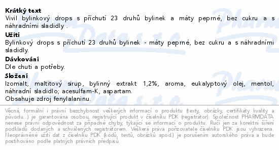 Vivil bylinkový drops s příchutí 23 druhů bylinek a máty peprné, bez cukru a s náhradními sladidly .