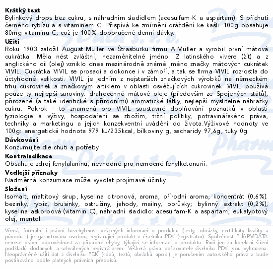 Bylinkový drops bez cukru, s náhradním sladidlem (acesulfam-K a aspartam). S příchutí černého rybízu a s vitaminem C. Přispívá ke zmírnění dráždění ke kašli. 100g obsahuje 80mg vitamínu C, což je 100% doporučené denní dávky.