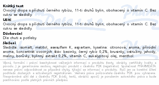 Ovocný drops s příchutí černého rybízu, 11-ti druhů bylin, obohacený o vitamín C. Bez cukru se sladidly.