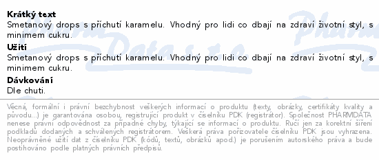 Smetanový drops s příchutí karamelu. Vhodný pro lidi co dbají na zdraví životní styl, s minimem cukru.