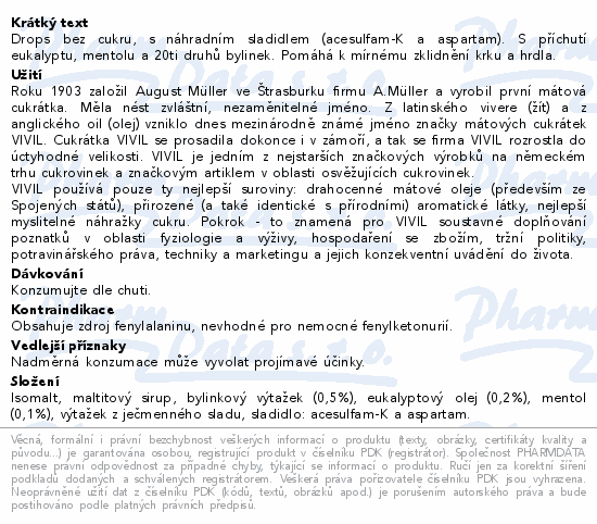 Drops bez cukru, s náhradním sladidlem (acesulfam-K a aspartam). S příchutí eukalyptu, mentolu a 20ti druhů bylinek. Pomáhá k mírnému zklidnění krku a hrdla.
