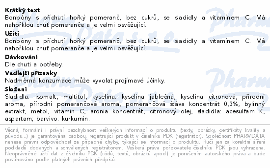 Bonbóny s příchutí hořký pomeranč, bez cukrů, se sladidly a vitamínem C. Má nahořklou chuť pomeranče a je velmi osvěžující.