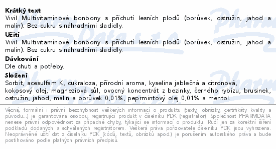 Vivil Multivitamínové bonbony s příchutí lesních plodů (borůvek, ostružin, jahod a malin). Bez cukru s náhradními sladidly.