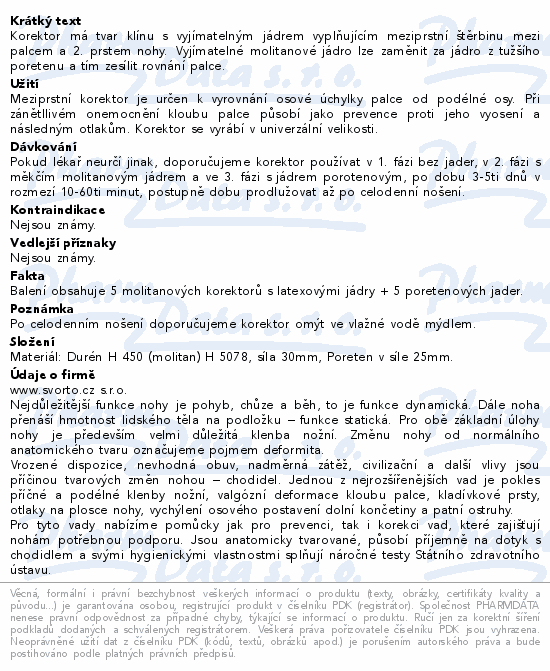 Korektor má tvar klínu s vyjímatelným jádrem vyplňujícím meziprstní štěrbinu mezi palcem a 2. prstem nohy. Vyjímatelné molitanové jádro lze zaměnit za jádro z tužšího poretenu a tím zesílit rovnání palce.