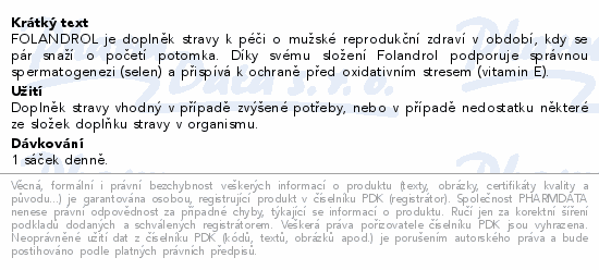 FOLANDROL je doplněk stravy k péči o mužské reprodukční zdraví v období, kdy se pár snaží o početí potomka. Díky svému složení Folandrol podporuje správnou spermatogenezi (selen) a přispívá k ochraně před oxidativním stresem (vitamin E).