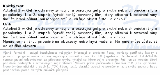 Actolind® w Gel je ochranný zvlhčující a ošetřující gel pro akutní nebo chronické rány a popáleniny 1. a 2. stupně. Vytváří tenký ochranný film, který přispívá k zotavení rány tím, že brání přilnutí mikroorganismů a udržuje oblast čistou a vlhkou.