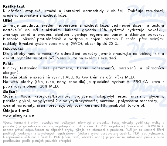 K ošetření atopické, iritační a kontaktní dermatitidy v obličeji. Zmírňuje zarudnutí, svědění, šupinatění a suchost kůže.