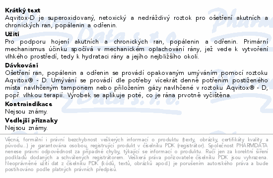 Aqvitox-D je superoxidovaný, netoxický a nedráždivý roztok pro ošetření akutních a chronických ran, popálenin a odřenin.