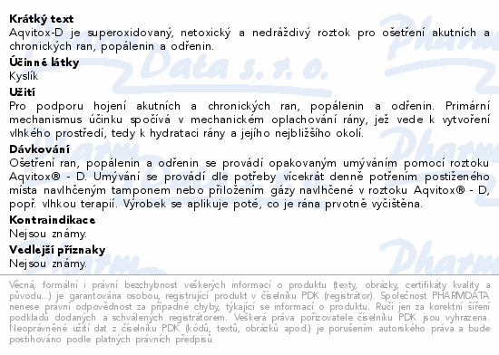 Aqvitox-D je superoxidovaný, netoxický a nedráždivý roztok pro ošetření akutních a chronických ran, popálenin a odřenin.