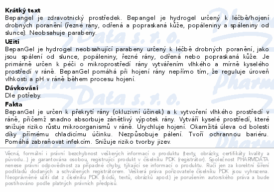 Bepangel je zdravotnický prostředek. Bepangel je hydrogel určený k léčbě/hojení drobných poranění (řezné rány, odřená a popraskaná kůže, popáleniny a spáleniny od slunce). Neobsahuje parabeny.