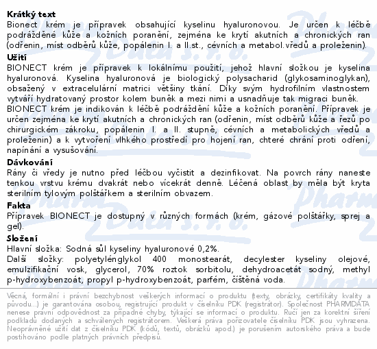 Bionect krém je přípravek obsahující kyselinu hyaluronovou. Je určen k léčbě podrážděné kůže a kožních poranění, zejména ke krytí akutních a chronických ran (odřenin, míst odběrů kůže, popálenin I. a II.st., cévních a metabol.vředů a proleženin).