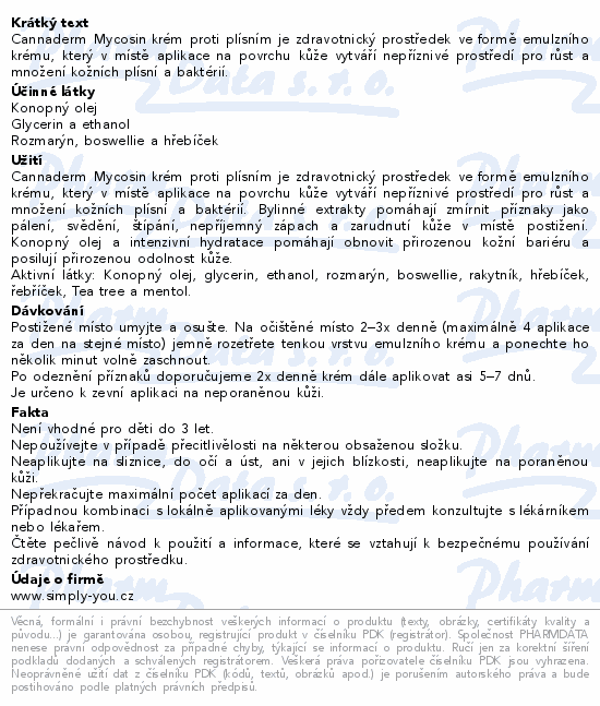Cannaderm Mycosin krém proti plísním je zdravotnický prostředek ve formě emulzního krému, který v místě aplikace na povrchu kůže vytváří nepříznivé prostředí pro růst a množení kožních plísní a baktérií.