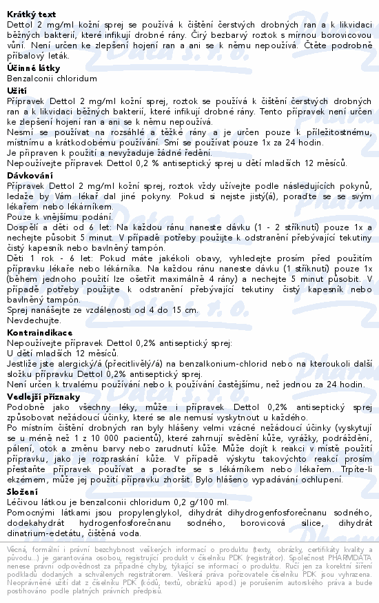 Dettol 2 mg/ml kožní sprej se používá k čištění čerstvých drobných ran a k likvidaci běžných bakterií, které infikují drobné rány. Čirý bezbarvý roztok s mírnou borovicovou vůní. Není určen ke zlepšení hojení ran a ani se k němu nepoužívá. Čtěte pozorně příbalový leták.