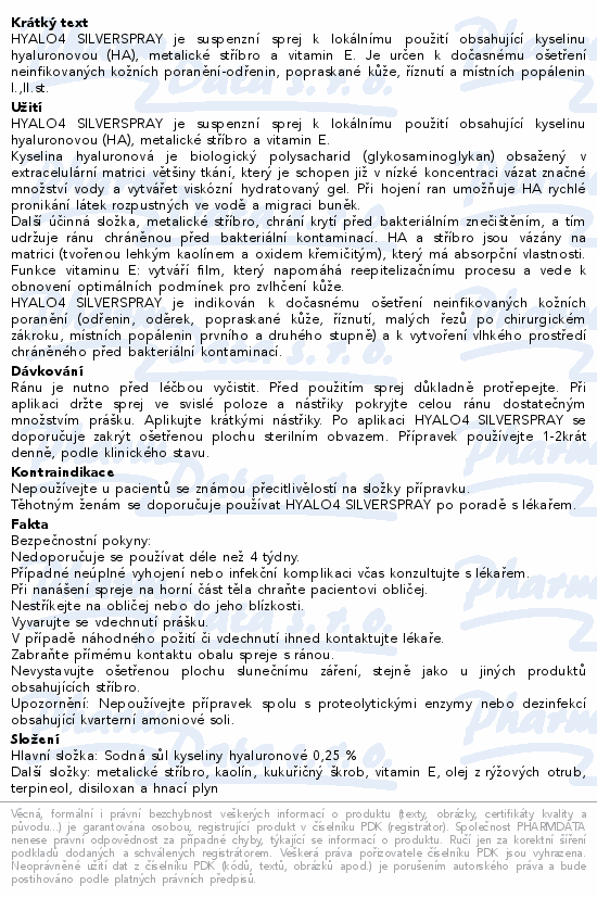 HYALO4 SILVERSPRAY je suspenzní sprej k lokálnímu použití obsahující kyselinu hyaluronovou (HA), metalické stříbro a vitamin E. Je určen k dočasnému ošetření neinfikovaných kožních poranění-odřenin, popraskané kůže, říznutí a místních popálenin I.,II.st.