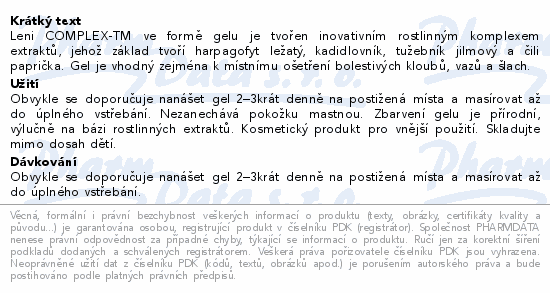Leni COMPLEX-TM ve formě gelu je tvořen inovativním rostlinným komplexem extraktů, jehož základ tvoří harpagofyt ležatý, kadidlovník, tužebník jilmový a čili paprička. Gel je vhodný zejména k místnímu ošetření bolestivých kloubů, vazů a šlach.