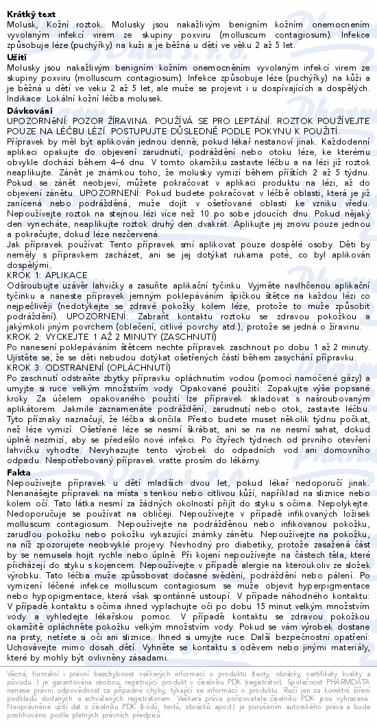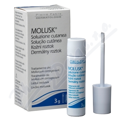Molusk, Kožní roztok. Molusky jsou nakažlivým benigním kožním onemocnením vyvolaným infekcí virem ze skupiny poxviru (molluscum contagiosum). Infekce způsobuje léze (puchýřky) na kuži a je běžná u dětí ve věku 2 až 5 let.