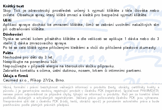 Stop Tick je zdravotnický prostředek určený k vyjmutí klíštěte z těla člověka nebo zvířete. Obsahuje spray, který klíště zmrazí a kleště pro bezpečné vyjmutí klíštěte.