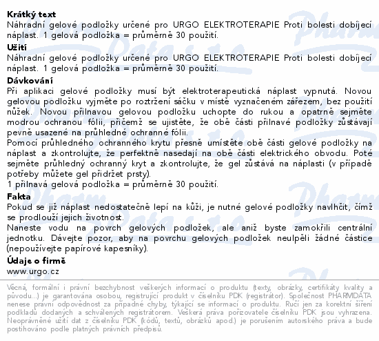 Náhradní gelové podložky určené pro URGO ELEKTROTERAPIE Proti bolesti dobíjecí náplast. 1 gelová podložka = průměrně 30 použití.